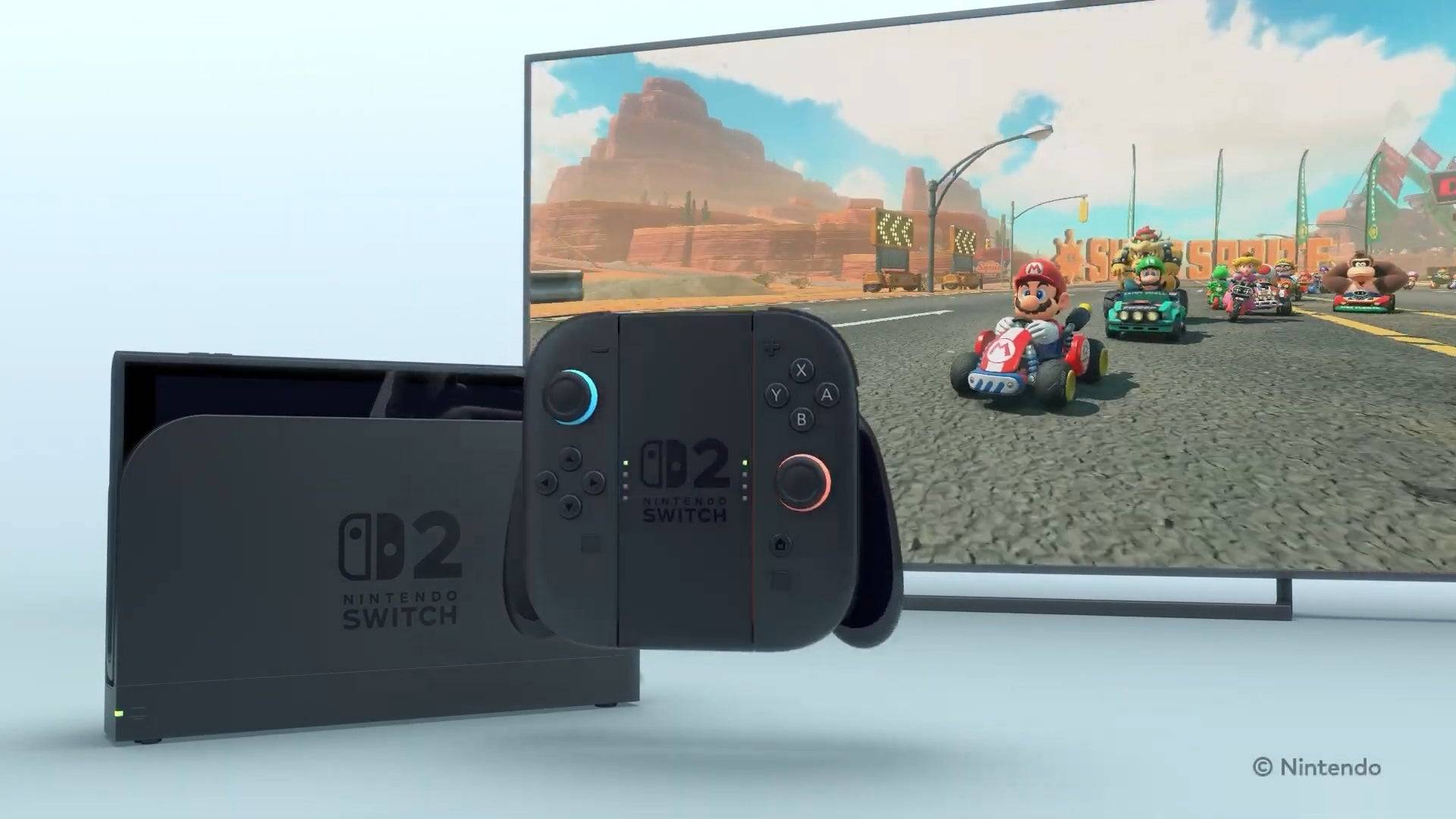22 - Der Switch 2 ist angedockbar, wobei das Dock dem Original ähnelt, aber mit abgerundeten Ecken und einem prominenten Switch 2 -Logo enthält.