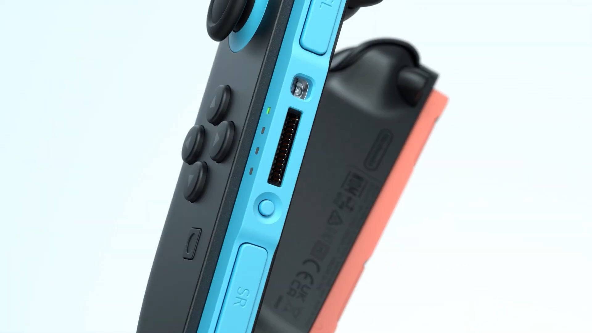04 - Die Joy -Con -Bindungsmethode hat sich geändert. Anstatt auf Schienen zu rutschen, stecken sie nun direkt in die Konsole und verbinden sich über einen hervorstehenden Stecker auf der Haupteinheit, das an einem Port am inneren Rand jeder Joy-Con anschließt. Gerüchte deuten auf eine magnetische Bindung hin, ähnlich wie die Magsafe von Apple.