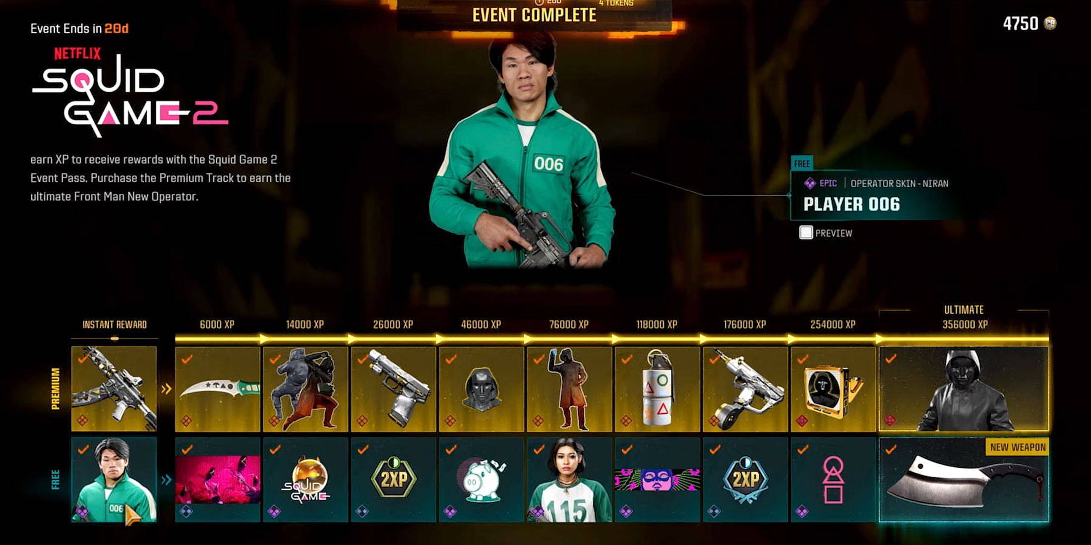 Der Pass Black Ops 6 und Warzone Event ist ein Fortschrittssystem, das mit bestimmten In-Game-Ereignissen verbunden ist. Es verfügt über kostenlose und Premium -Ebenen mit jeweils 10 Belohnungen. Der Premium -Pass kostet 1.100 Kabeljaupunkte (das gleiche wie der Standard -Battle -Pass) und entsperren zusätzliche Belohnungen. Belohnungen spiegeln das Thema der Veranstaltung wider. Zum Beispiel bot die Squid Game Collaboration Kosmetik, die von der Netflix -Serie inspiriert wurde.