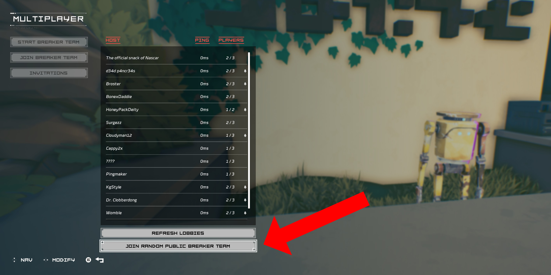 Drücken Sie die Interaktionstaste (normalerweise R1 oder RB), um auf das Mehrspieler -Menü zuzugreifen. Hier können Sie ein Breaker -Team erstellen oder beitreten und Einladungen verwalten. Um mit Freunden zu spielen, wählen Sie "Breaker -Team erstellen".