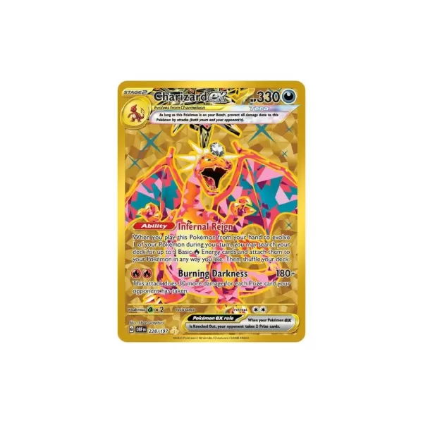 Charizard Ex est la star hors concours de cet ensemble, avec deux variantes hautement souhaitables. La version rare de l'illustration spéciale est à couper le souffle, sans doute l'une des meilleures œuvres de charizard de tous les temps, tandis que l'or hyper rare maintient l'excitation en vie avec son design flashy.