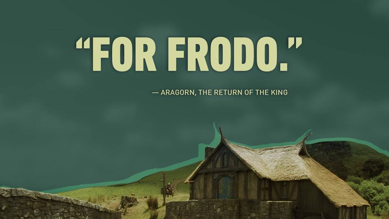 O grito de batalha de Aragorn, dedicando a luta a Frodo, galvaniza as forças do bem em sua posição final contra Sauron.
