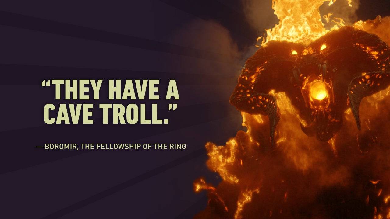 A reação humorística e aterrorizada de Boromir ao troll da caverna acrescenta um momento leve à cena tensa de batalha.