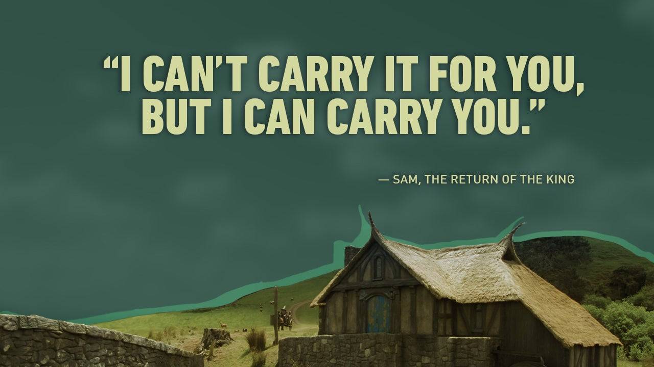 O ato altruísta de Sam de levar Frodo Up Mount Doom simboliza o tema da amizade e da perseverança.